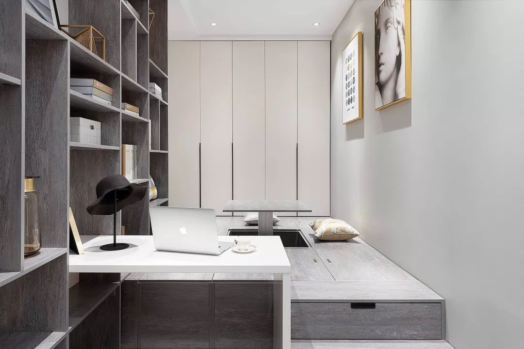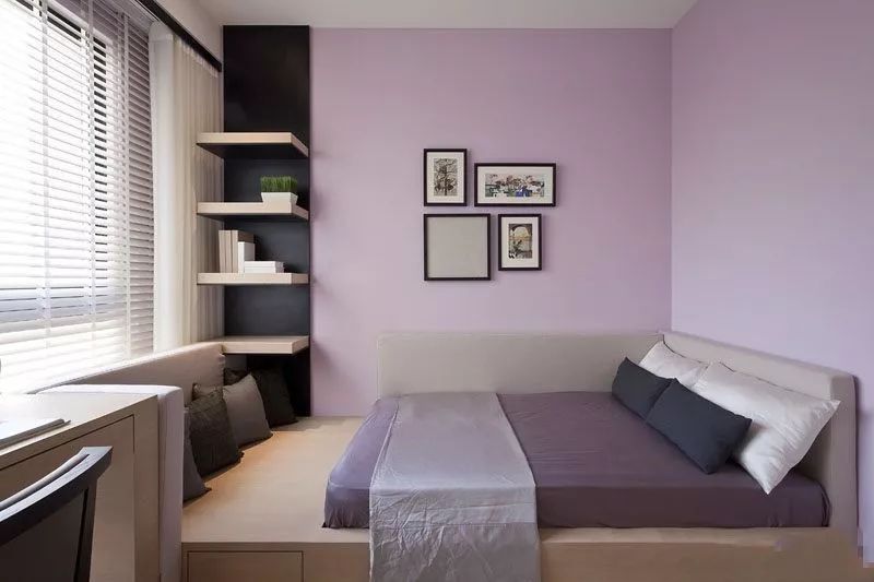 比如:在卧室里设置一张地台床,旁边组合书桌、衣柜一体化设计,底部预留出充足的储物空间,这样不仅可以收纳暂时闲置的衣物,也可以用来睡觉、办公、学习,一举多得。