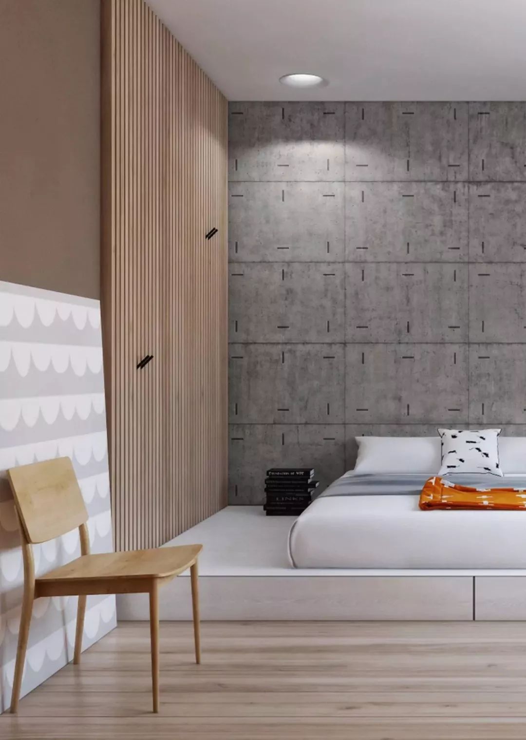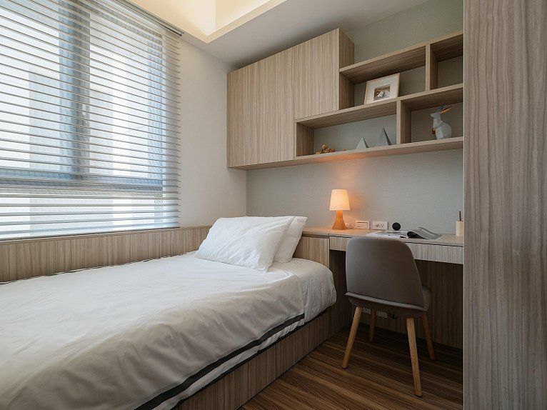 此外,一体化的设计还可以让视线得到延伸,采用木板上墙的形式营造出三面围合的效果,让睡眠环境变得更加温馨、舒适。