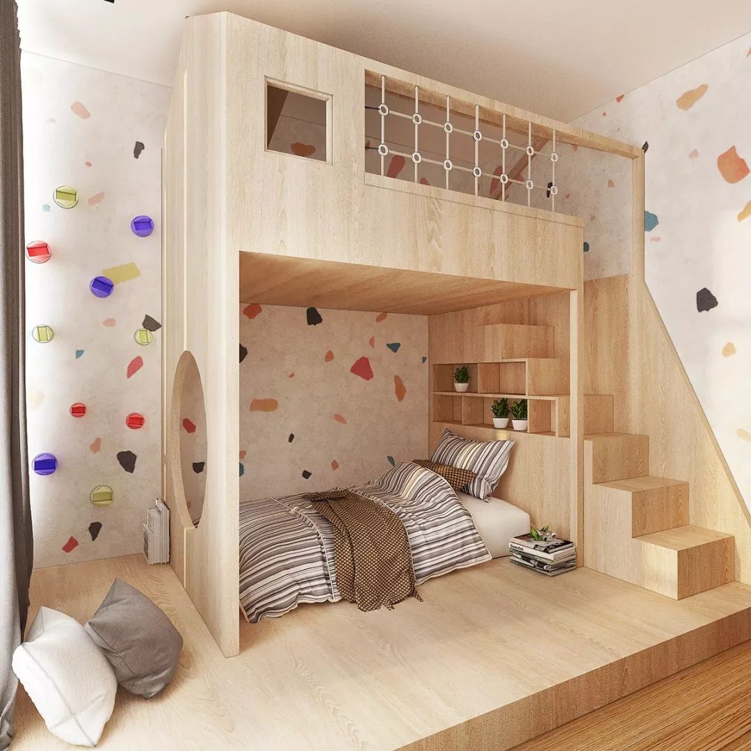 你可以将地台床与学习桌合二为一,再留出一大块空地给孩子自由玩耍,让各功能区动静分明,大大提高空间使用率。