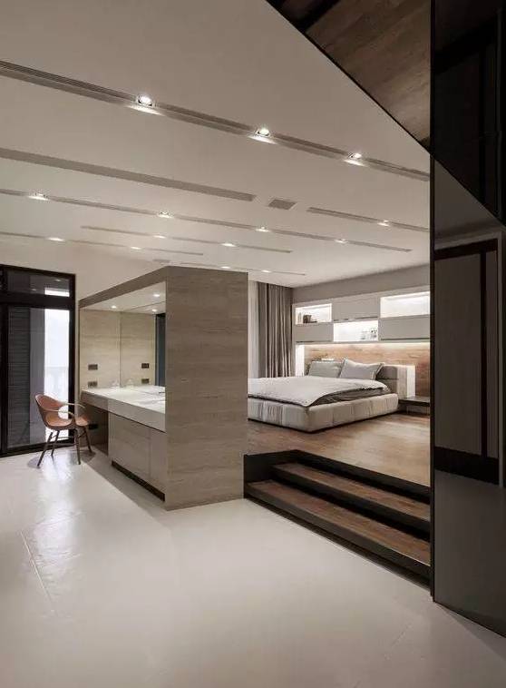 将多功能的地台运用到主卧之中,视觉上更为整洁美观,也能更好地利用空间,划分功能区域,让一间房拥有更多可能性。